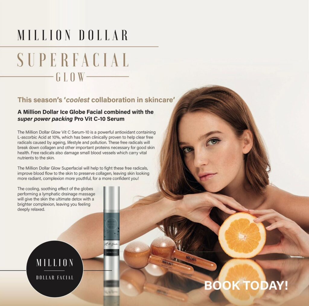 The Glow Superfacial combines Million Dollar Vitamin C10 serum with Million Dollar Ice Globes for a luxurious experience. Vitamin C10 serum contains L-ascorbic acid at a volume of 10% and acts as a powerful antioxidant. L-ascorbic acid has been proven to clear free radicals caused by ageing, every-day pollutants and lifestyle choices that later cause damage to the tiny blood vessels responsible for carrying vital nutrients to the skin. This is the ultimate facial for targeting age spots, evening out skin tone and neutralising hyper-pigmentations, leaving you with a radiant and youthful complexion.